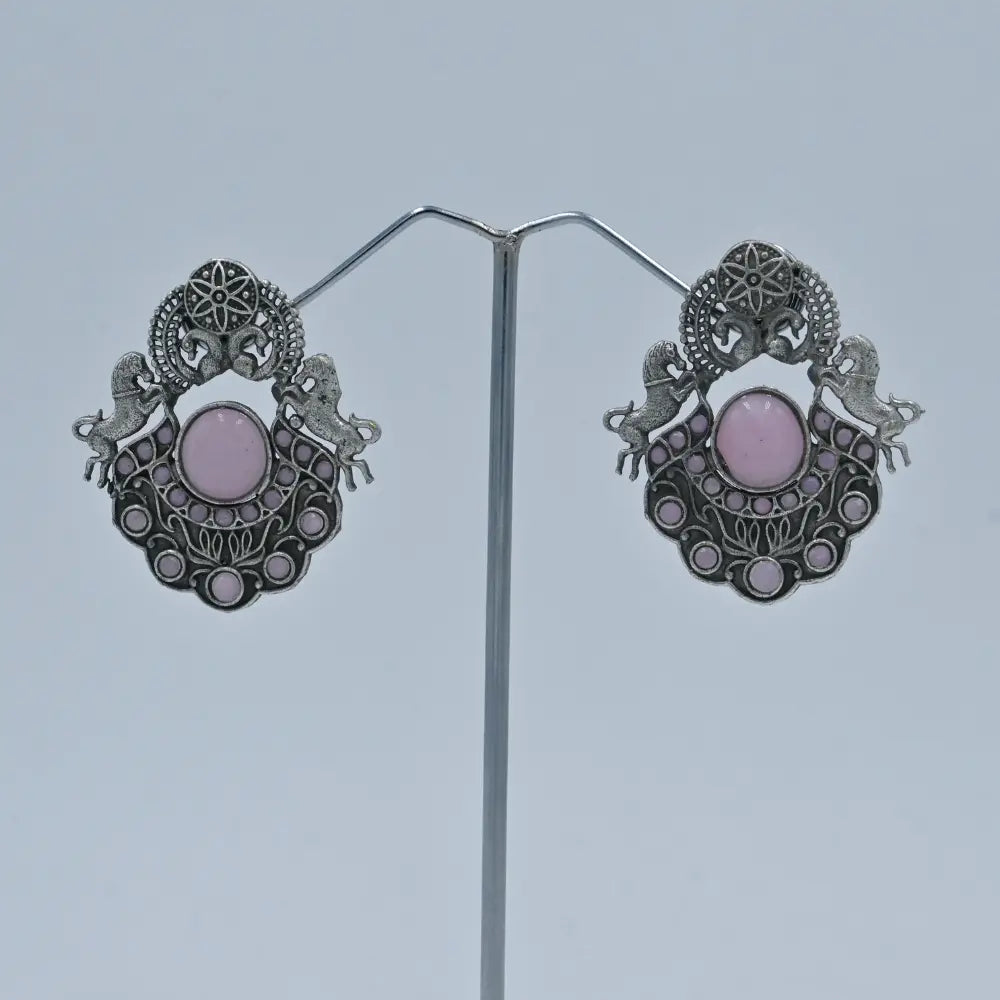 These imitation oxidized earrings showcase an exquisite design with a central pink stone surrounded by intricate patterns and horse motifs. The delicate pink detailing adds a touch of elegance, making these earrings a perfect choice for those who appreciate traditional artistry with a contemporary flair. Lightweight and comfortable, they add charm to both casual and festive outfits.