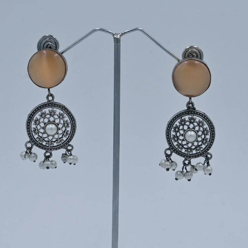 These imitation oxidized earrings feature an elegant circular design with intricate filigree work and a prominent pearl at the center. The top of the earrings showcases a muted peach stone that complements the oxidized finish, while the tiny pearl danglers add charm and sophistication. Ideal for those who love timeless jewelry with a modern touch.