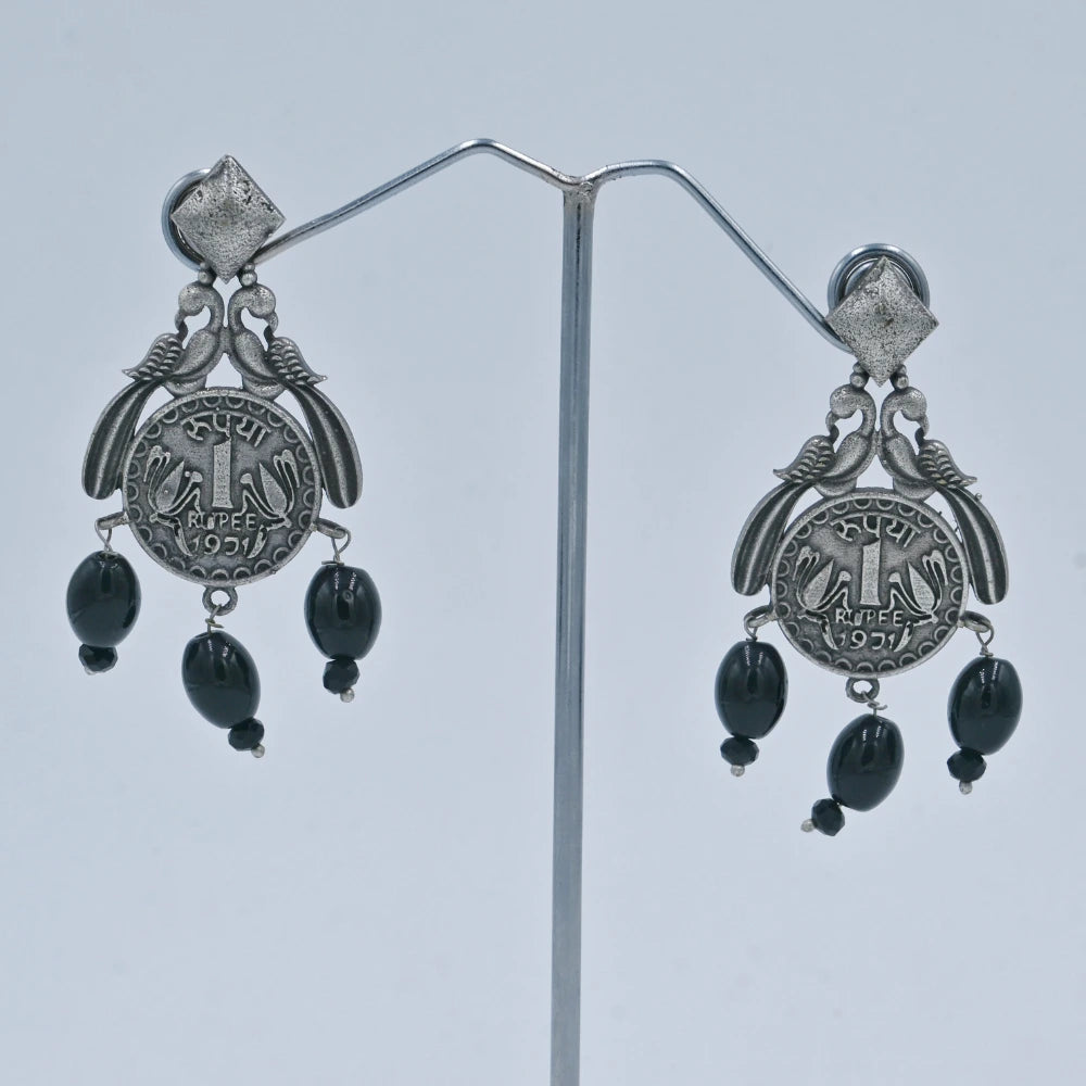 These heritage-inspired oxidized earrings showcase a unique one-rupee coin design from 1991, adorned with two intricately crafted peacocks on top. The antique silver finish and dangling black beads add a bold yet elegant touch. Perfect for those who love to blend tradition with modern fashion.