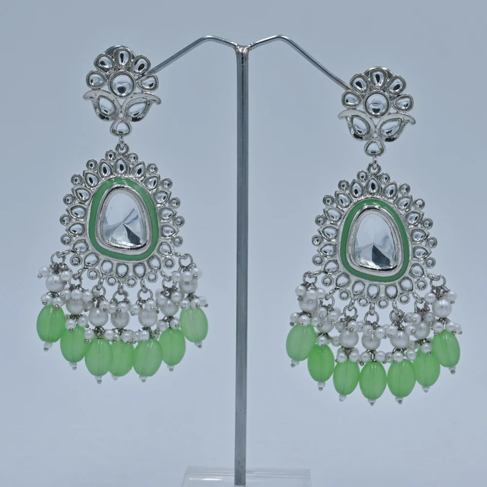 Stunning Silver-Plated Kundan Earrings with Green Beads