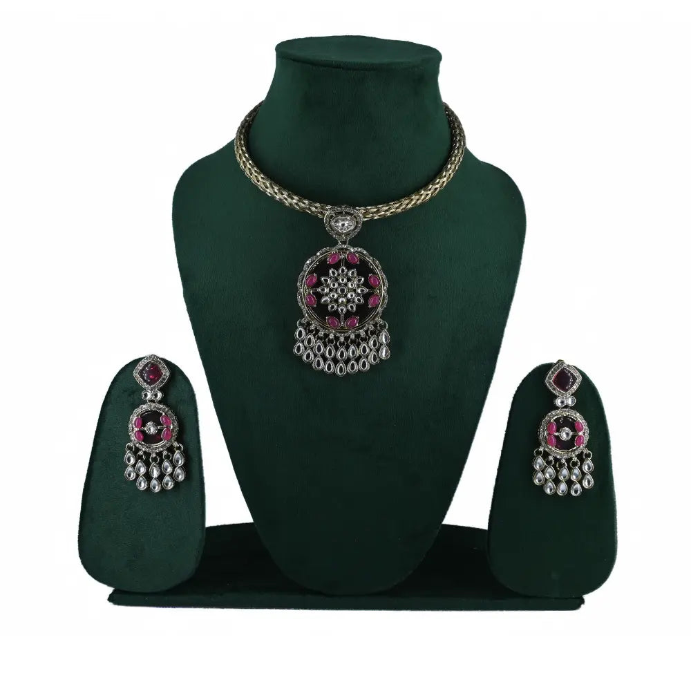 The matching drop earrings complement the necklace perfectly, featuring the same  design with kundan embellishments. This versatile set pairs beautifully with both traditional and contemporary outfits.