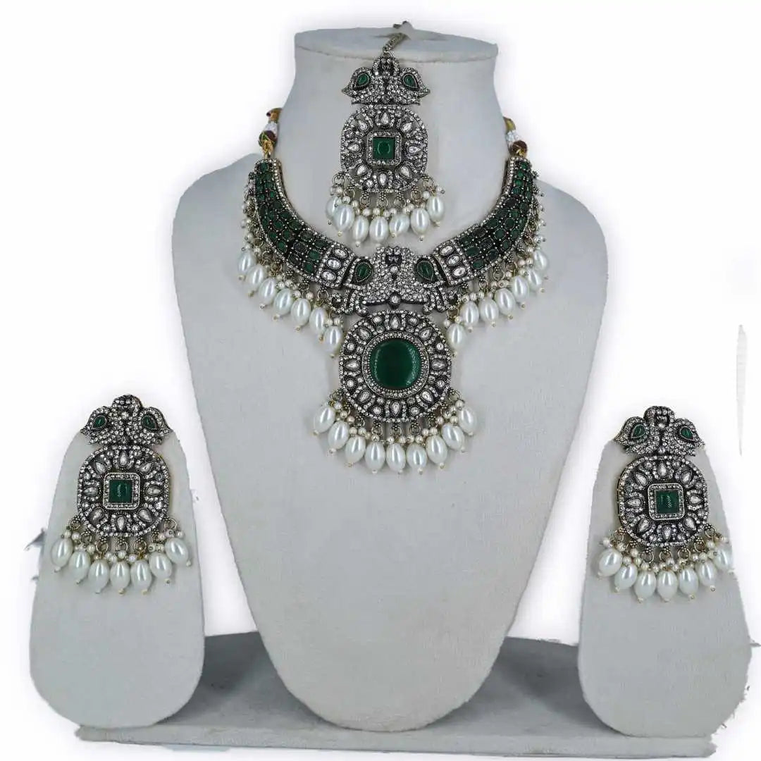 Antique looking Green AD Kundan Necklace Set – Pearl Drop Bridal Jewelry