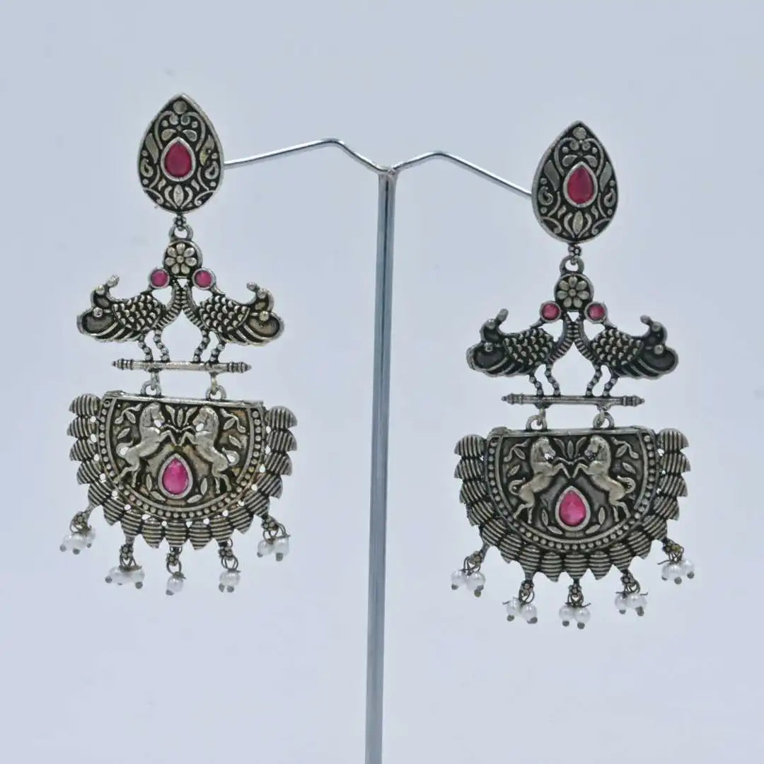 Elegant Antique Silver-Plated Earrings with Peacock & Lion Motif