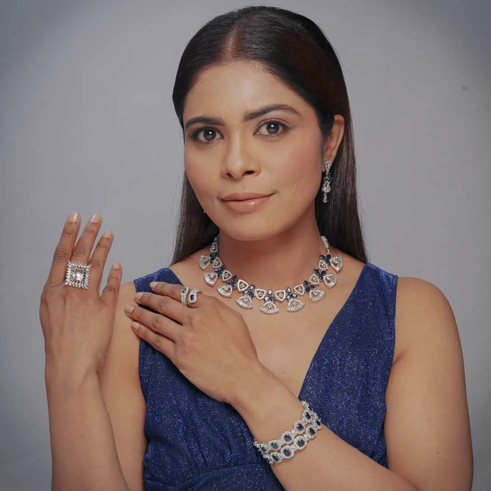 Elevate your style with this exquisite blue stone imitation jewellery set, crafted for elegance and sophistication. This stunning set includes a beautifully designed necklace, matching earrings,  all adorned with dazzling blue stones and shimmering American diamonds. The intricate silver-plated finish enhances its luxurious appeal, making it a perfect accessory for weddings, parties, and festive occasions.